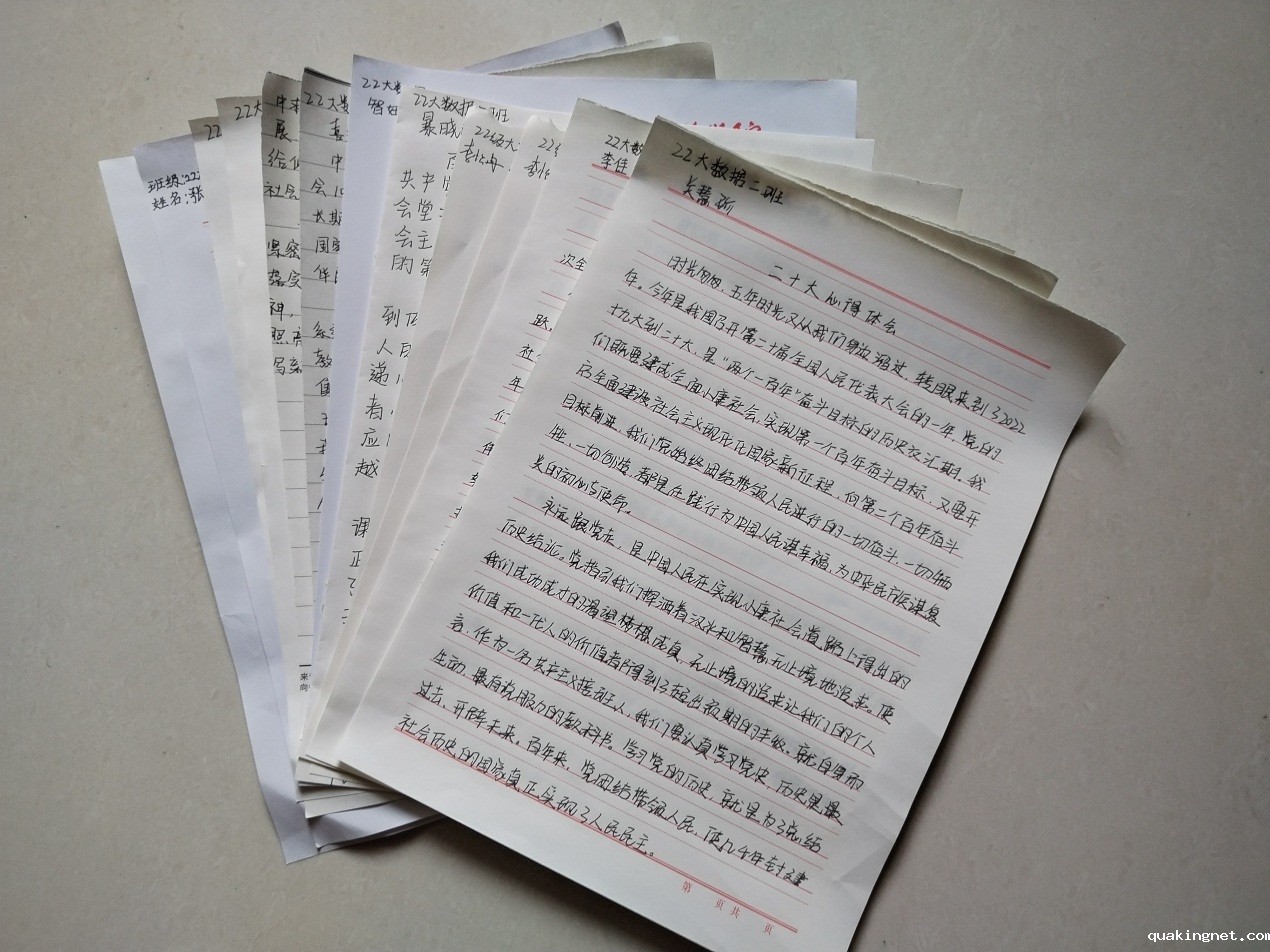 辅导员李胜岚老师组织学生用纸笔抒写了他们对党的二十大召开后的思考和认识,同时表达对党的热爱和奋进的决心。